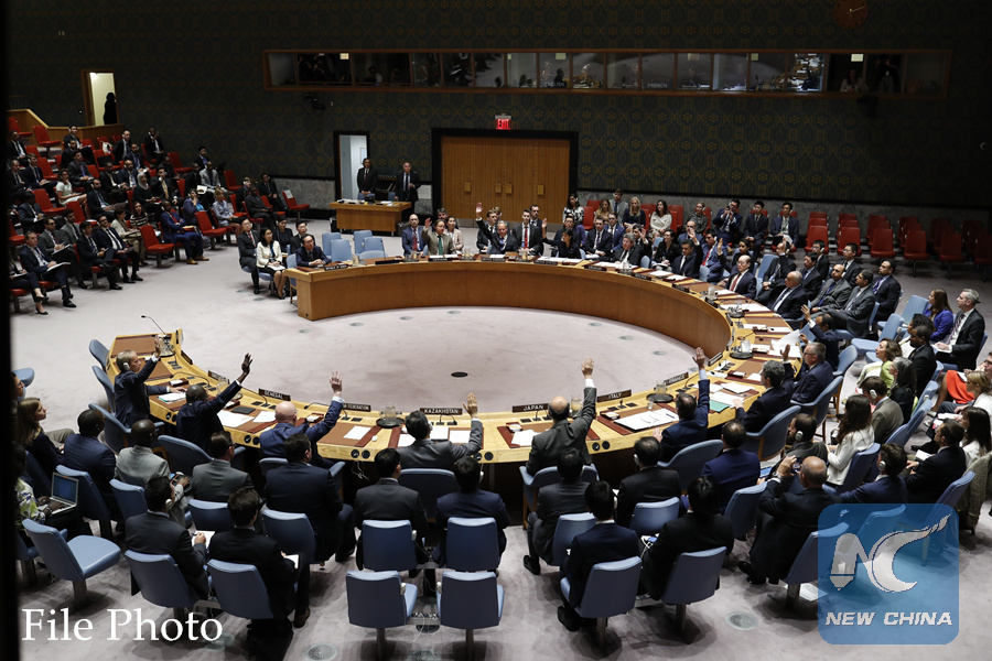 Photo taken on Sept. 11, 2017 shows the United Nations Security Council voting on a resolution on the Democratic People's Republic of Korea (DPRK) at the UN headquarters in New York. (Xinhua/Li Muzi)