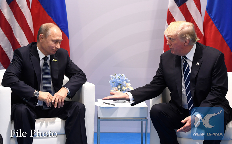 This file photo taken on July 7, 2017 shows US President Donald Trump and Russia's President Vladimir Putin shaking hands during a meeting on the sidelines of the G20 Summit in Hamburg, Germany. (AFP PHOTO)