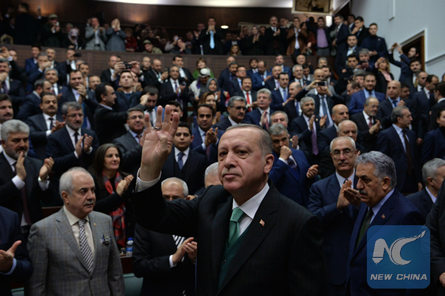 Turkish President Recep Tayyip Erdogan (Front) attends the ruling Justice and Development Party's parliamentary group meeting in Ankara, Turkey, Feb. 6, 2018.(Xinhua/Mustafa Kaya)