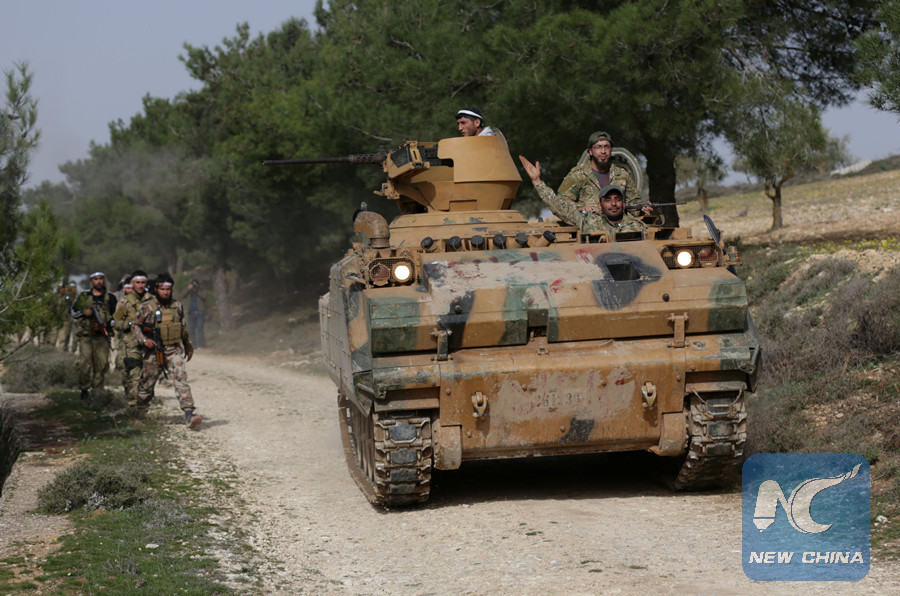 ANKARA, March 14 (Xinhua) -- Turkish President Recep Tayyip Erdogan on Wednesday expressed hope that Turkey's military and its allies would completely take Syrian Kurdish-held city of Afrin by Wednesday evening.