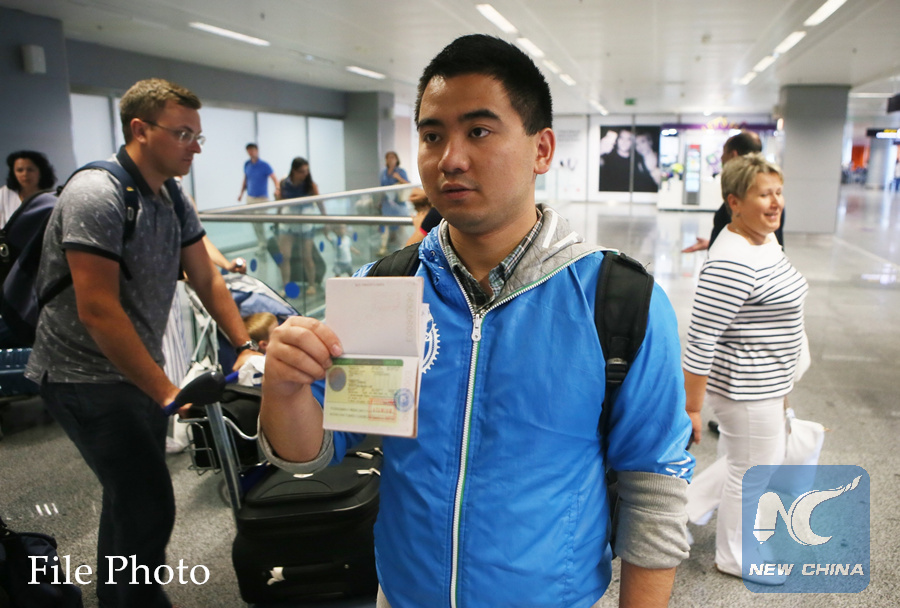 A Chinese traveller displays his visa-on-arrival at the Boryspil airport in Kiev, Ukraine, on June 20, 2016. (Xinhua/Sergii)