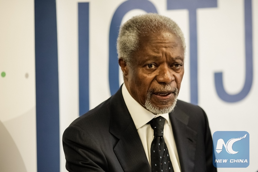 File photo shows former United Nations Secretary-General Kofi Annan attends a press conference during his visit in Bogota, Colombia, on Feb. 25, 2015. (Xinhua/Jhon Paz)