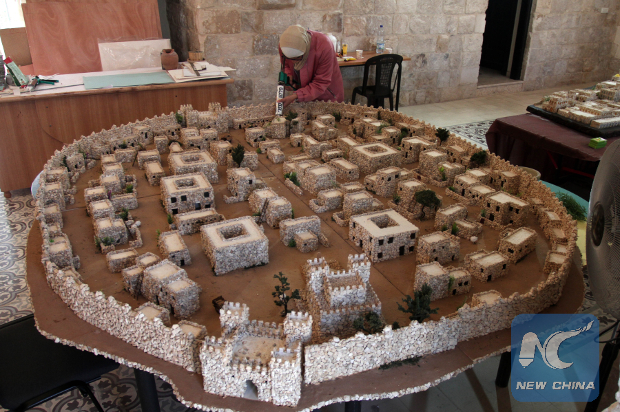 Palestinian artist Noura Jardaneh displays her miniature replica of the old city of Nabllus in the West Bank, on Oct. 29, 2018. (Xinhua/Nidal Eshtayeh)