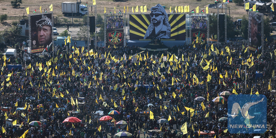 Palestinian Fatah supporters wave party flags during a rally marking the 14th anniversary for the death of late Palestinian leader Yasser Arafat, in Gaza City on Nov. 20, 2018. (Xinhua/Stringer)