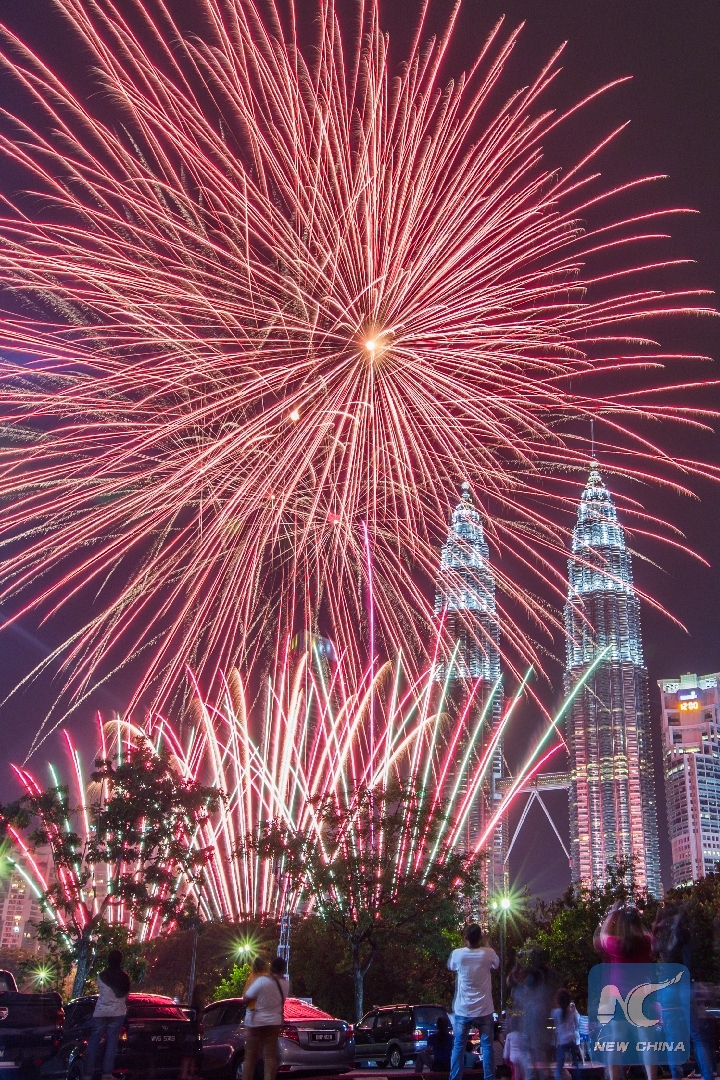 New Year fireworks are seen near the Petronas Twin Towers in Kuala Lumpur, Malaysia, Jan. 1, 2019. (Xinhua/Zhu Wei)