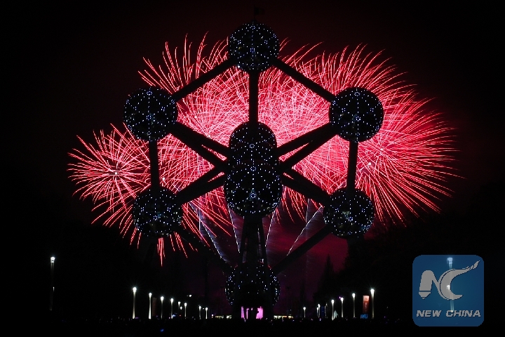 Fireworks are seen in the sky behind the Atomium in Brussels, Belgium, Jan. 1, 2019 to celebrate the new year. (Xinhua/Zheng Huansong)