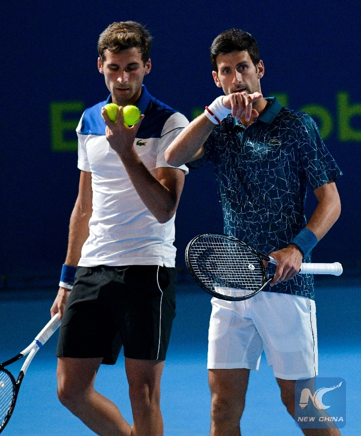 Marko Djokovic (L) and Novak Djokovic of Serbia react during a doubles match against Mubarak Shannan Zayid of Qatar and Cem Ilkel of Turkey at the ATP Qatar Open tennis match in Doha, capital of Qatar, Dec. 31, 2018. Marko Djokovic and Novak Djokovic won 2-1. (Xinhua/Nikku)