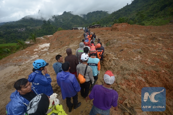 Rescuers walk on the mud after landslides struck at Sinaresmi village in Suka Bumi district, West Java, Indonesia, Jan. 1, 2019. A total of 41 villagers were missing after fatal landslides struck Suka Bumi district in Indonesia's West Java Province on Monday. (Xinhua/Demy Sanjaya)
