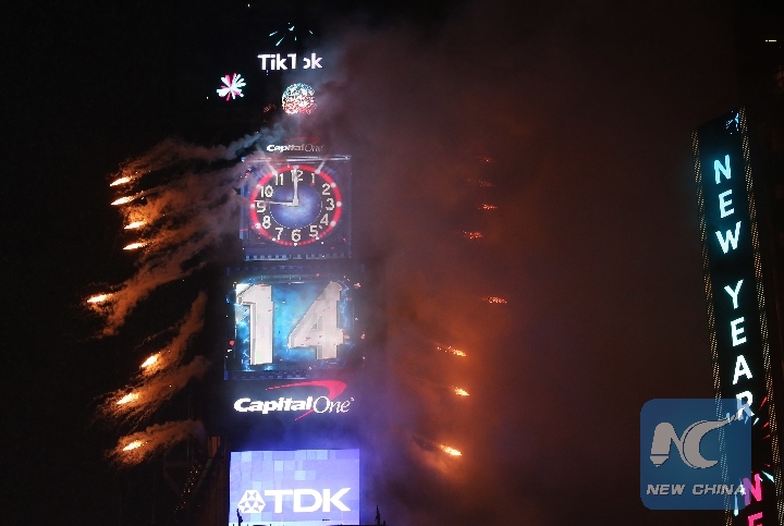 Fireworks go off during the annual New Year's Eve celebration at Times Square in New York, the United States, Dec. 31, 2018. (Xinhua/Qin Lang)