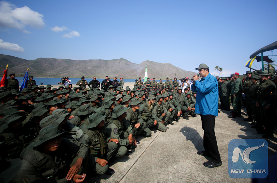 Venezuela's President Nicolas Maduro speaks to soldiers while attending a military exercise in Turiamo, Venezuela on February 3, 2019.