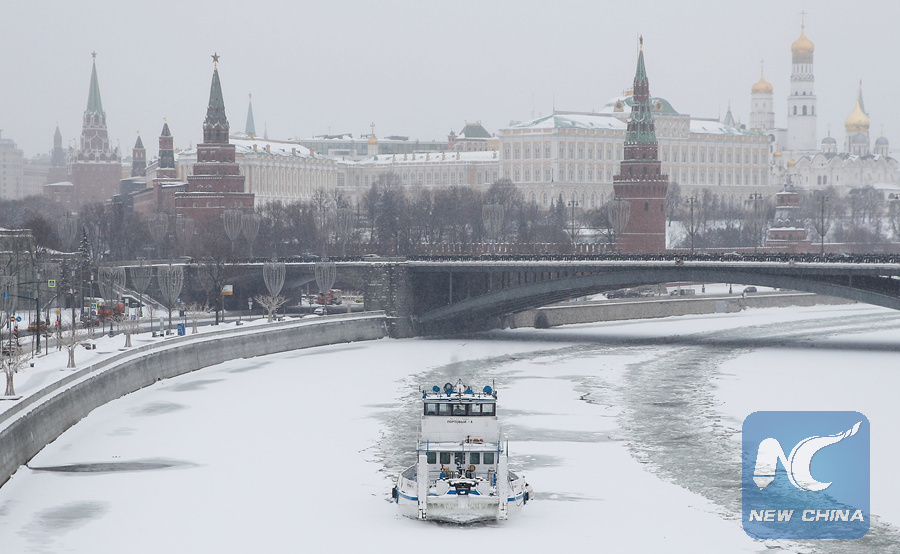 Icebraker floats on Moskva river past Moscow Kremlin during heavy snowfall in Moscow, Russia January 27, 2019. (REUTERS)