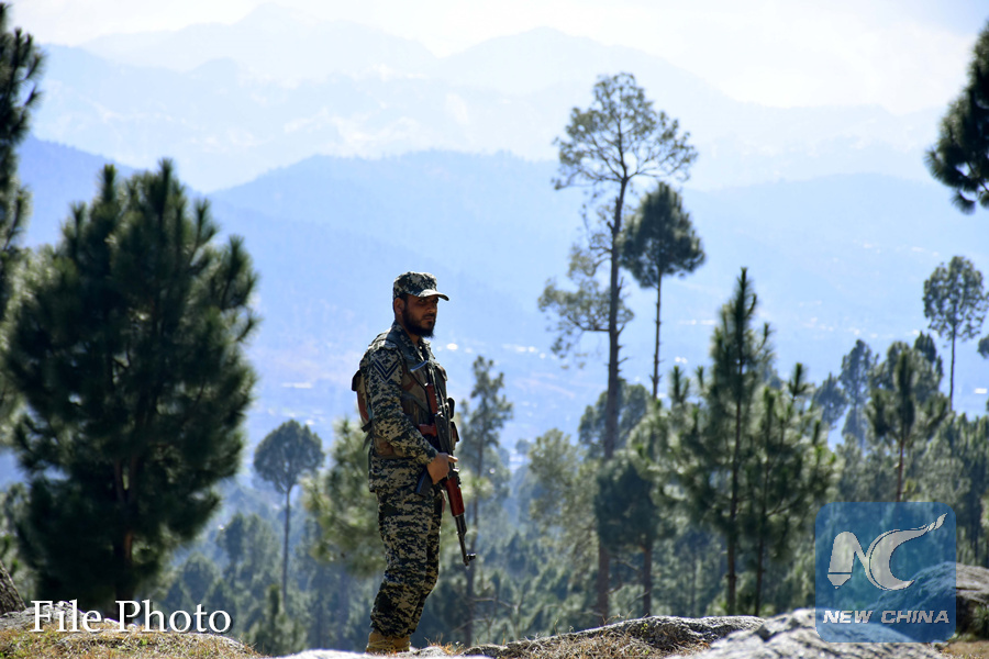 A Pakistani soldier stands guard in the area where Indian warplanes released payload, in Balakot, Pakistan, on Feb. 27, 2019. (Xinhua)
