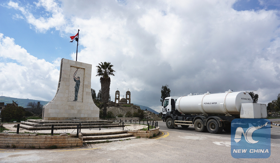 A UN truck heads towards the Quneitra Crossing, the only land crossing between Syria's Quneitra and Israeli-occupied Golan Heights, on March 26, 2019. (Xinhua/Wang Jian)