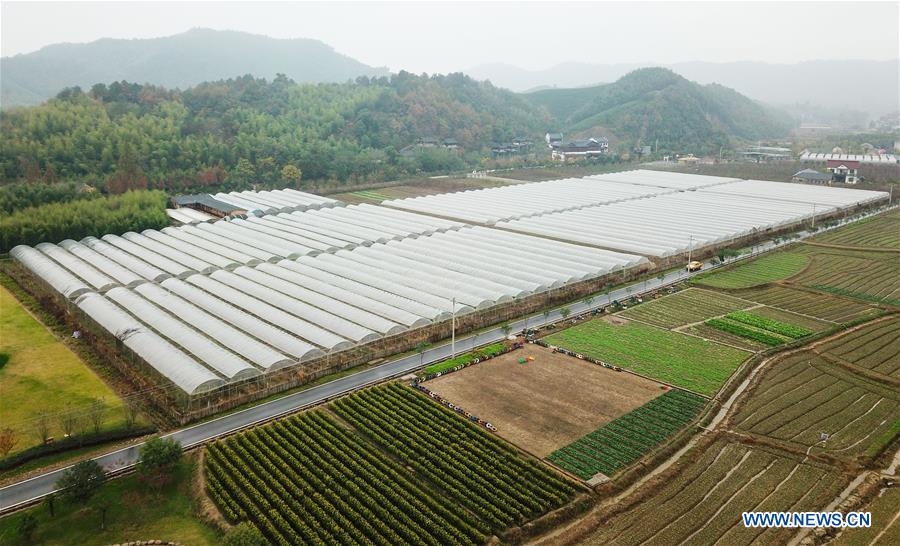 Aerial photo taken on Nov. 16, 2018 shows a farm in Lujia Village of Anji County, east China's Zhejiang Province. Lujia Village is located in the mountainous region in northeastern Anji. The village has a population of over 2,200 and about 533 hectares of bamboo forests. To build a beautiful village and improve the living of local villagers, Lujia implemented a comprehensive plan for rural, industrial and tourism development in recent years. The income of the village's collective economy surged from 18,000 yuan (about 2,500 U.S. dollars) in 2011 to 3.3 million yuan (about 475,000 U.S. dollars) in 2017. The per capita income of local people arrives at 35,000 yuan (about 5,000 U.S. dollars). So far, the village has collective assets valued at nearly 200 million yuan (about 28.8 million U.S. dollars). (Xinhua/Meng Chenguang)