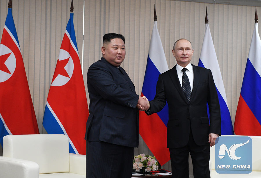 VLADIVOSTOK, Russia, April 25 (Xinhua) -- Russian President Vladimir Putin and top leader of the Democratic People's Republic of Korea (DPRK) Kim Jong Un on Thursday said that they had substantial discussions on bilateral ties and the Korean Peninsula nuclear issue during their first-ever meeting.