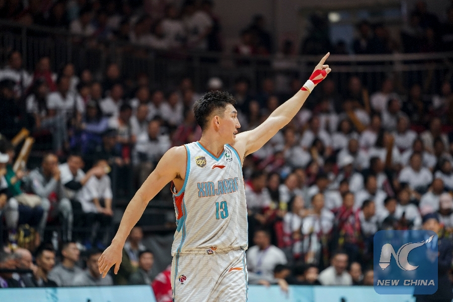 Xinjiang's captain Kyranbek gives directions to teammates in Game 3 of the CBA finals on May 1, 2019. (Xinhua/Hu Huhu)