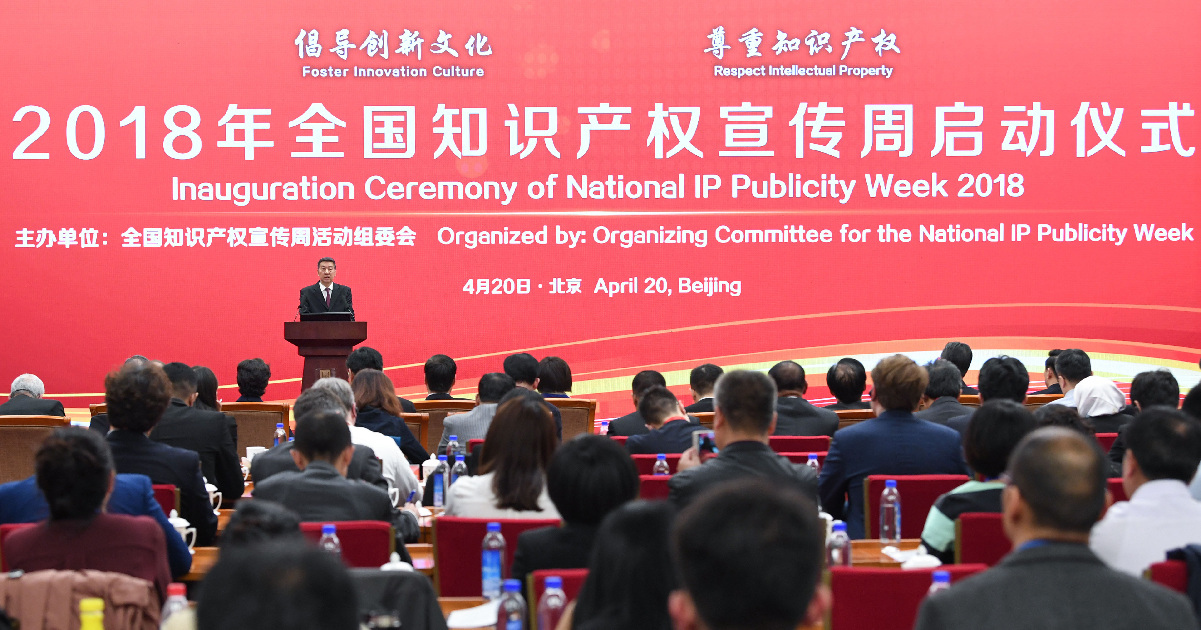 Chinese State Councilor Wang Yong attends the inauguration ceremony of National IP Publicity Week 2018 in Beijing, capital of China, April 20, 2018. (Xinhua/Shen Hong)
