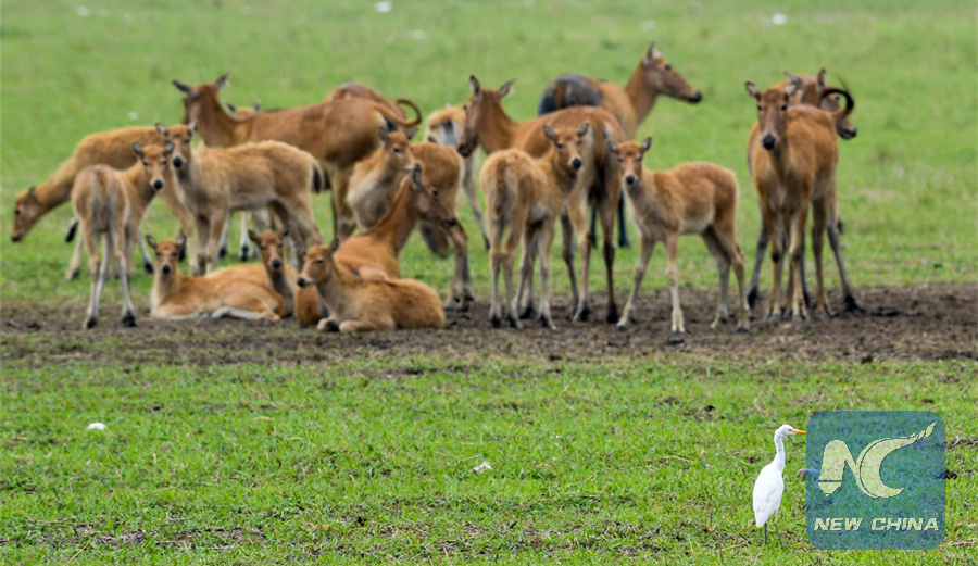 A flock of elks and an egret are seen at the Dafeng Milu National Nature Reserve in the city of Yancheng, east China's Jiangsu Province, June 27, 2019. (Xinhua/Li Bo)