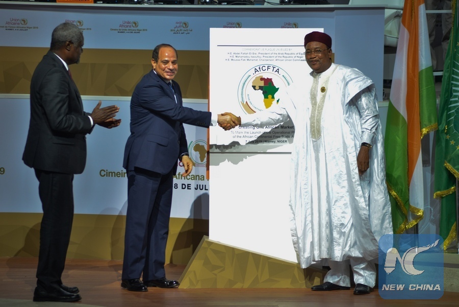 Chairperson of the African Union (AU) Commission Moussa Faki Mahamat, Egyptian President and African Union Chairperson Abdel Fattah al-Sisi and Nigerien President Mahamadou Issoufou (L to R) react during the launching ceremony of the operational phase of the African Continental FreeTrade Area (AfCFTA) Agreement in Niamey, capital of Niger, July 7, 2019. (Str/Xinhua)