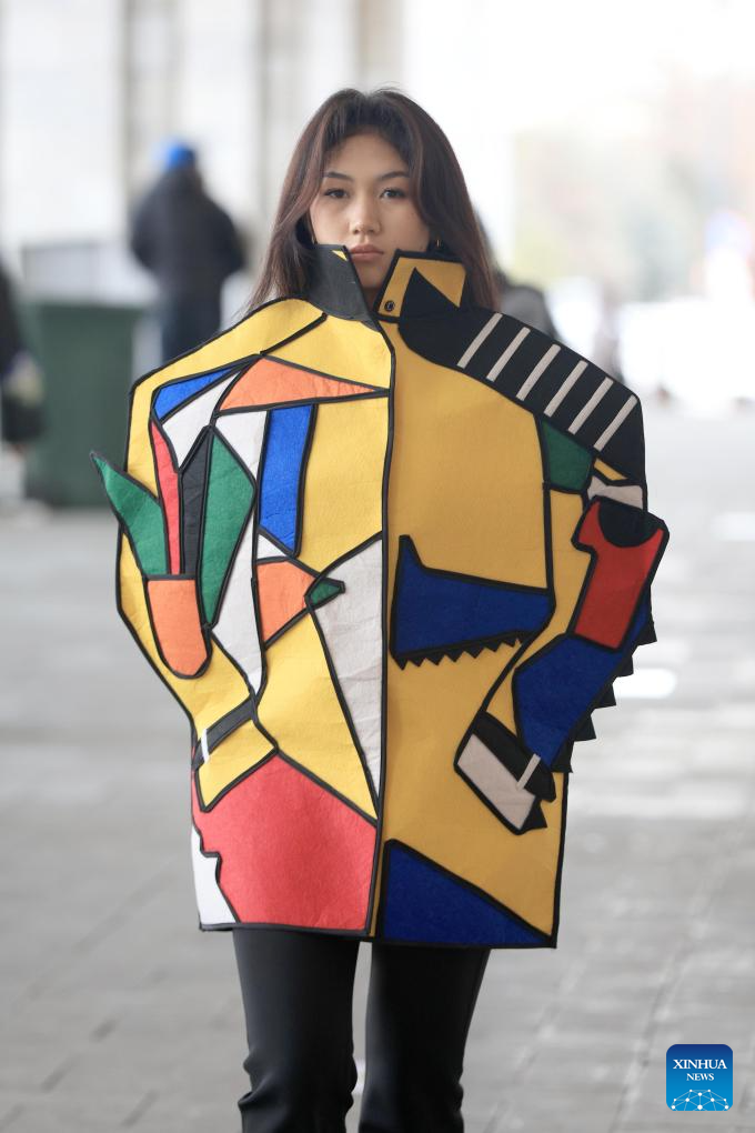 A models displays a garment made from recycled textile materials during an eco-friendly street fashion show in Bishkek, Kyrgyzstan, Dec. 12, 2025. (Photo by Roman/Xinhua)
