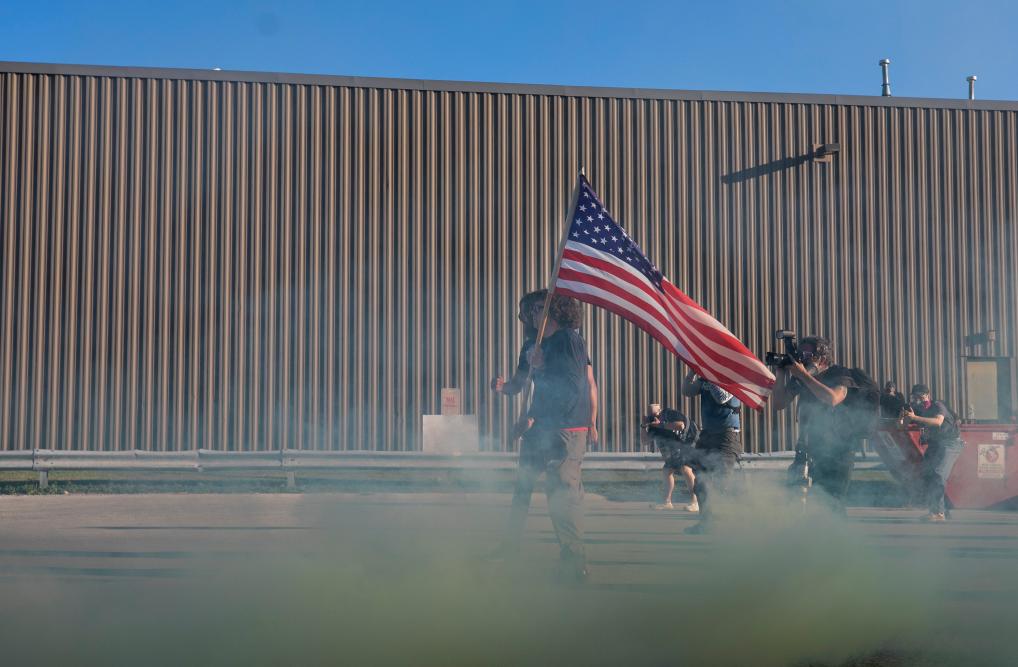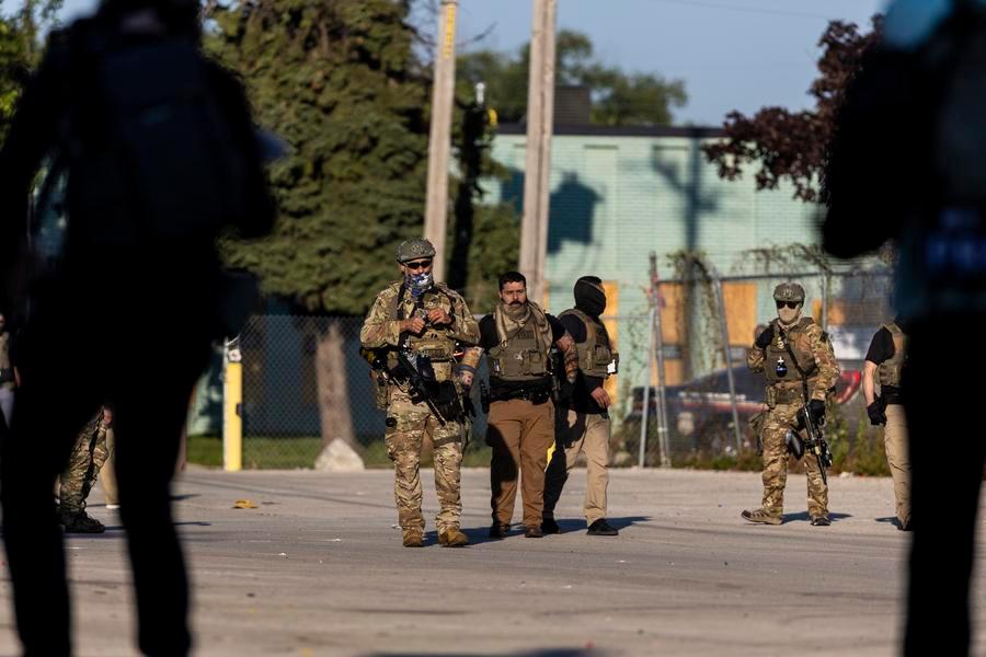 Immigration and Customs Enforcement (ICE) officers guard amidst protests to secure an area outside an ICE facility in Broadview in the western suburbs of Chicago, the United States, on Sept. 26, 2025. (Photo by Vincent D. Johnson/Xinhua)