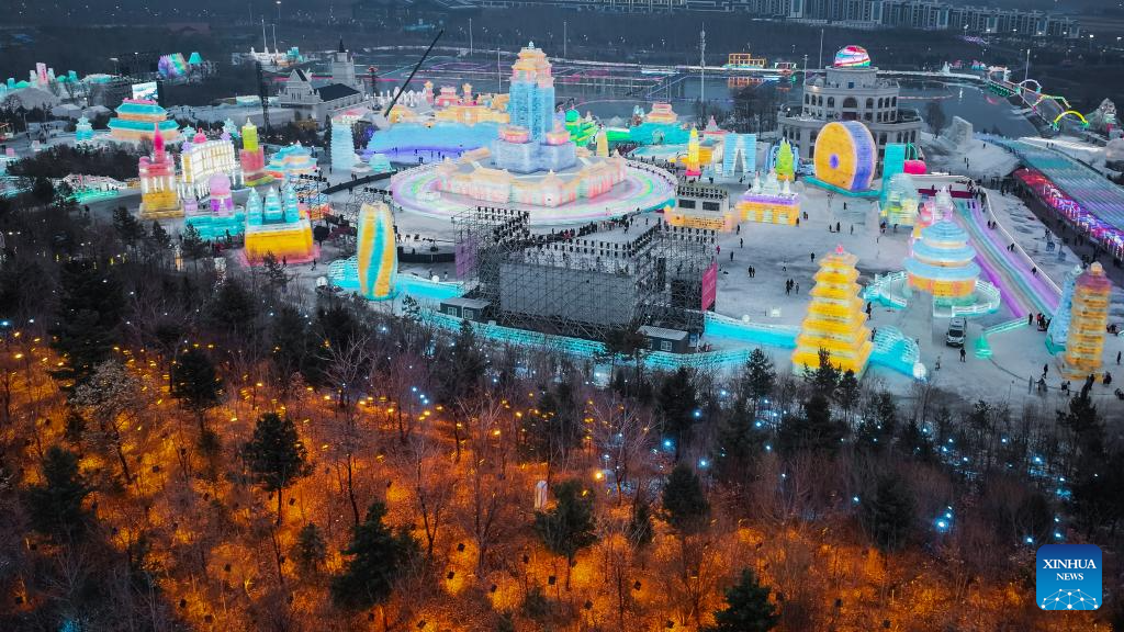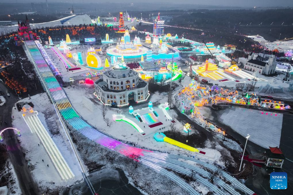 An aerial drone photo taken on Dec. 19, 2025 shows a view of Changchun Ice and Snow New World in Changchun, northeast China's Jilin Province. The 29th Changchun Ice and Snow Festival kicked off here on Friday. (Photo by Zhang Yang/Xinhua)