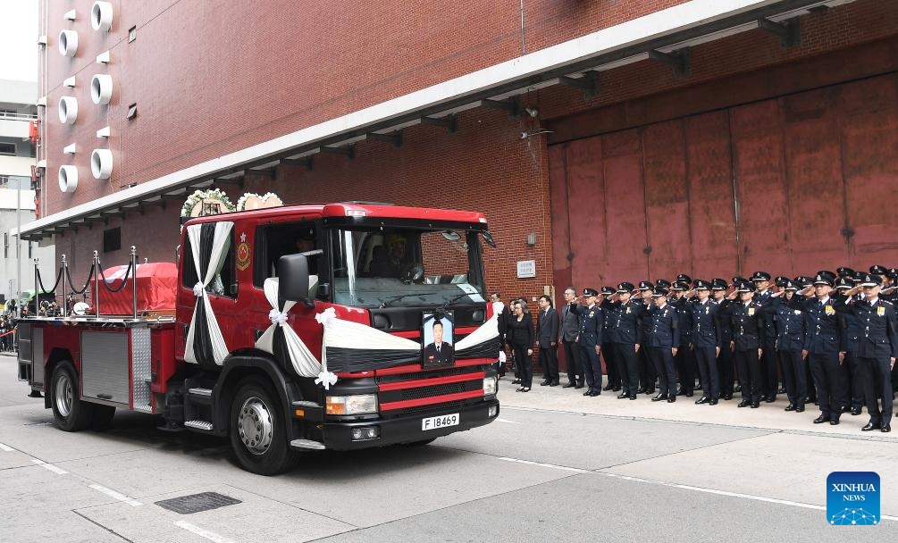 HONG KONG, Dec. 19 (Xinhua) -- The Fire Services Department (FSD) of the Hong Kong Special Administrative Region (HKSAR) government on Friday held an official funeral service with full honors for the late firefighter Ho Wai-ho, who sacrificed his life battling a major blaze in Tai Po. John Lee, chief executive of the HKSAR and a host of senior HKSAR government officials attended the ceremony to pay their respects.