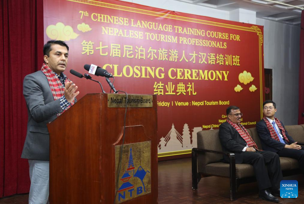 Ram Krishna Lamichhane (1st L), director general of Nepal's Department of Tourism, speaks at the closing ceremony of the seventh Chinese Language Training Course for Nepalese Tourism Professionals in Kathmandu, Nepal, Dec. 19, 2025. A total of 47 Nepali tourism professionals received certificates at the conclusion of a Chinese language training session here on Friday. (Xinhua/Zhang Ping)
