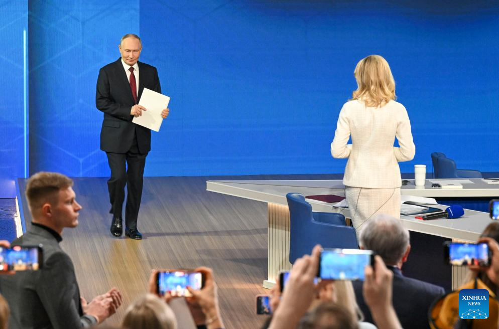 Russian President Vladimir Putin enters the venue of his annual year-end press conference in Moscow, Russia, Dec. 19, 2025. (Xinhua/Hao Jianwei)