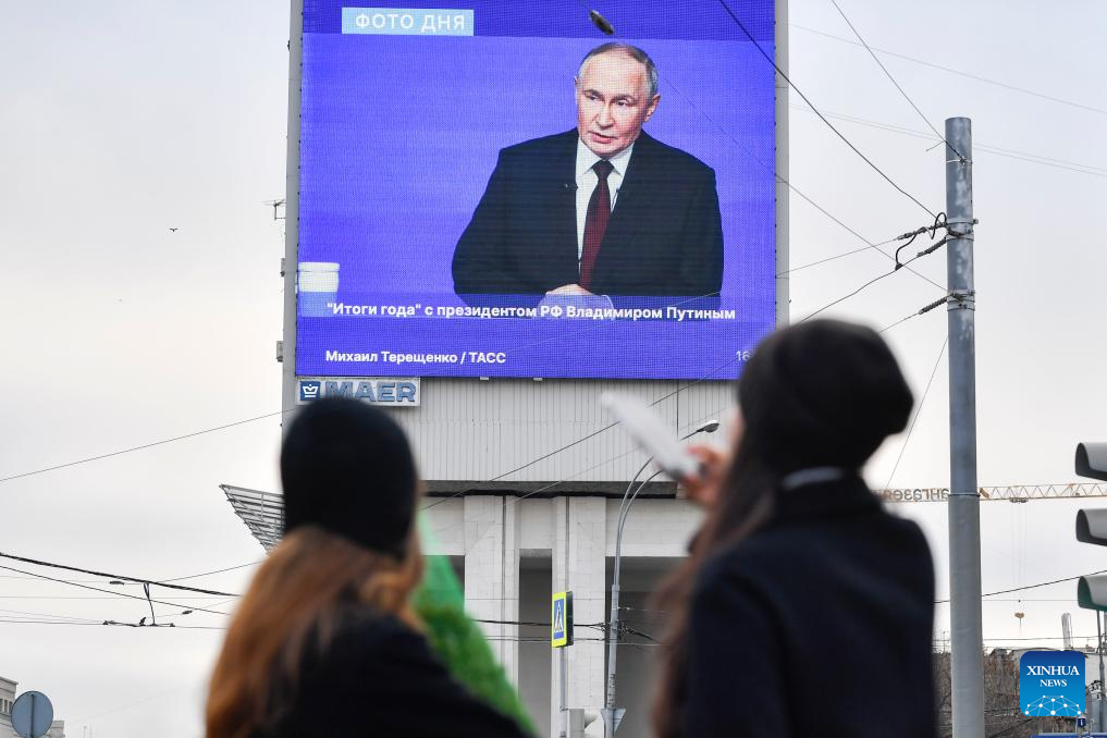 Citizens watch a screen showing Russian President Vladimir Putin speaking during his annual year-end press conference on a street in Moscow, Russia, Dec. 19, 2025. (Xinhua/Hao Jianwei)