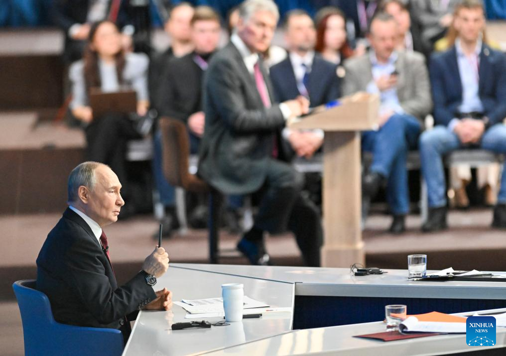 Russian President Vladimir Putin responds to a question from Xinhua reporter during his annual year-end press conference in Moscow, Russia, Dec. 19, 2025. (Xinhua/Hao Jianwei)
