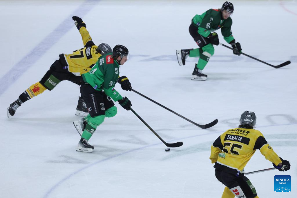Raphael Andergassen (R) of HC Falkensteiner Pustertal shoots during the 2025/26 Win2day Ice Hockey League match between Olimpija LJubljana and HC Falkensteiner Pustertal in Ljubljana, Slovenia, Dec. 19, 2025. (Photo by Zeljko Stevanic/Xinhua)