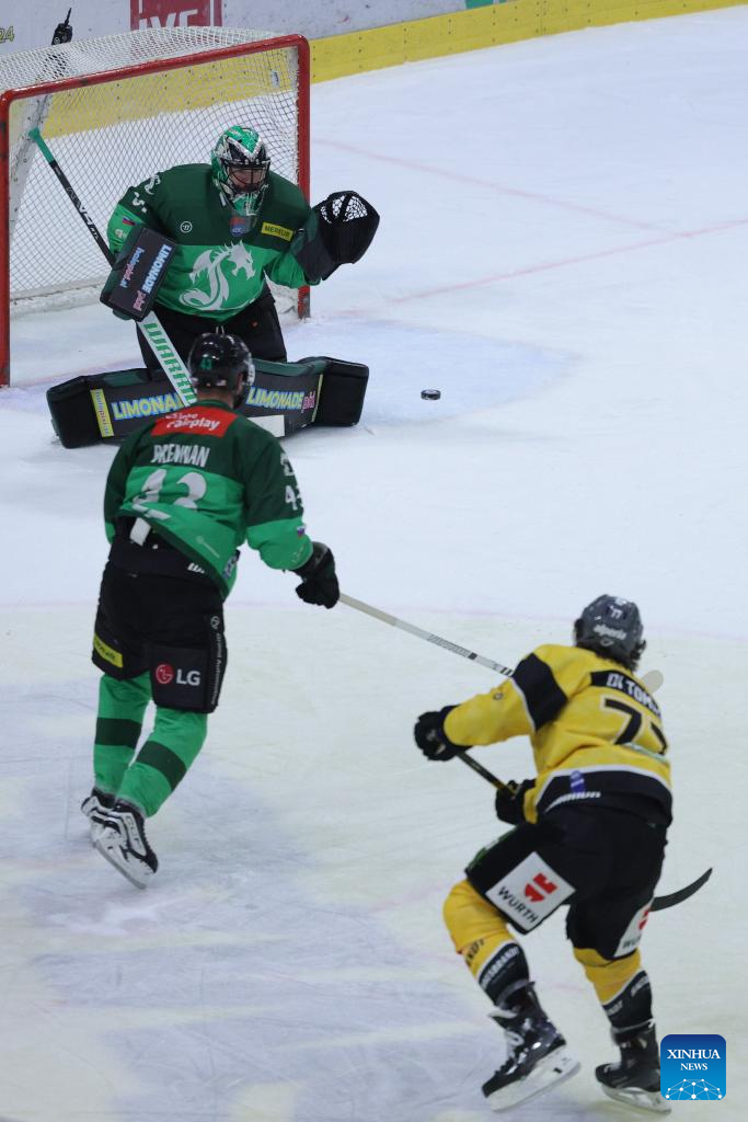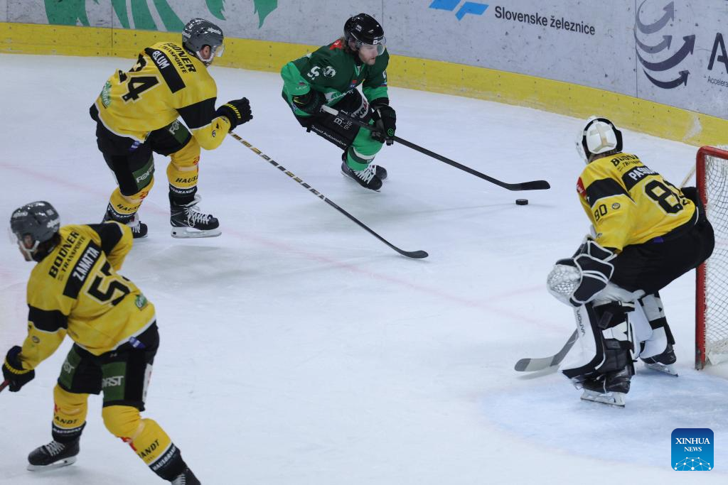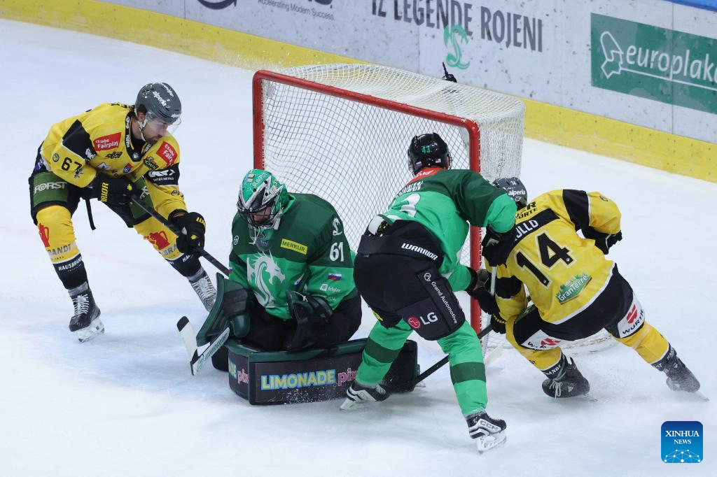 Jan Drozg (2nd R) of Olimpija Ljubljana competes during the 2025/26 Win2day Ice Hockey League match between Olimpija LJubljana and HC Falkensteiner Pustertal in Ljubljana, Slovenia, Dec. 19, 2025. (Photo by Zeljko Stevanic/Xinhua)
