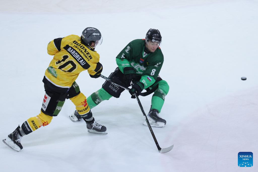 Maks Bukovec (R) of Olimpija Ljubljana controls the puck during the 2025/26 Win2day Ice Hockey League match between Olimpija LJubljana and HC Falkensteiner Pustertal in Ljubljana, Slovenia, Dec. 19, 2025. (Photo by Zeljko Stevanic/Xinhua)
