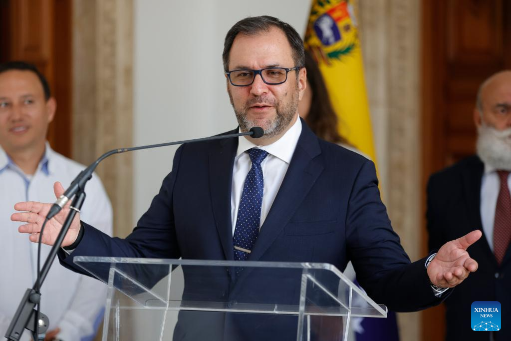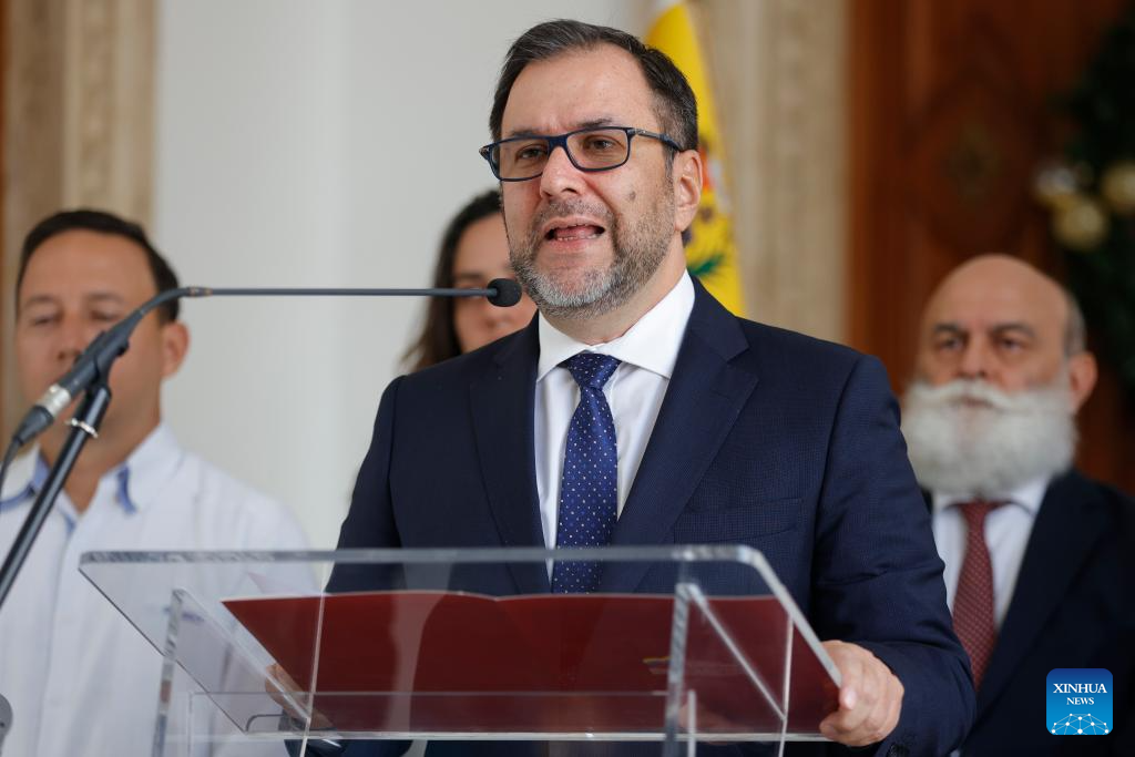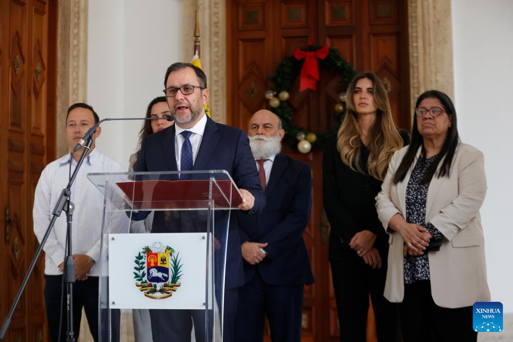 Venezuelan Foreign Minister Yvan Gil reads a letter sent by Venezuelan President Nicolas Maduro to heads of state of countries in the Latin American and Caribbean region, in Caracas, Venezuela, Dec. 22, 2025. Venezuelan President Nicolas Maduro has sent a letter to heads of state of countries in the Latin American and Caribbean region, denouncing the escalation of U.S. aggressions against Venezuela and their impact on the region, Gil said Monday. (Xinhua)