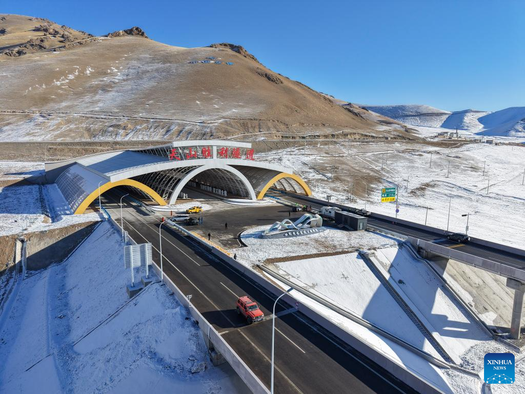 An aerial drone photo shows the exit of the Tianshan Shengli Tunnel on the Urumqi-Yuli Expressway in northwest China's Xinjiang Uygur Autonomous Region, Dec. 26, 2025. The 22.13-km Tianshan Shengli Tunnel, the world's longest expressway tunnel, officially opened to traffic on Friday. Traversing the central Tianshan Mountains in northwest China's Xinjiang Uygur Autonomous Region, the tunnel slashes what was once a several-hour mountain drive to just 20 minutes. As a vital artery linking city clusters in northern and southern Xinjiang, the G0711 Urumqi-Yuli Expressway, including the tunnel, entered operation on the same day. (Xinhua/Hu Huhu)