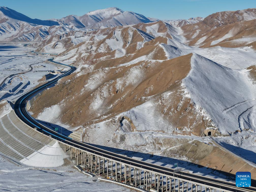 An aerial drone photo shows the Urumqi-Yuli Expressway in Hejing County, northwest China's Xinjiang Uygur Autonomous Region, Dec. 26, 2025. The 22.13-km Tianshan Shengli Tunnel, the world's longest expressway tunnel, officially opened to traffic on Friday.