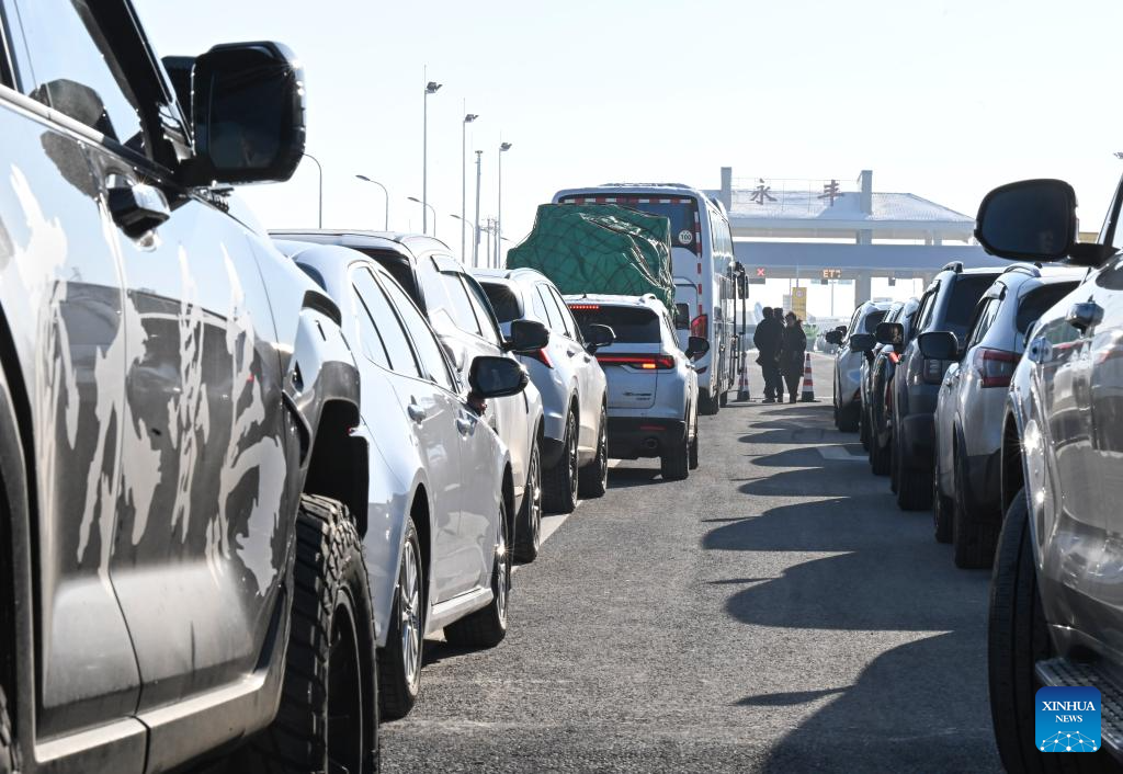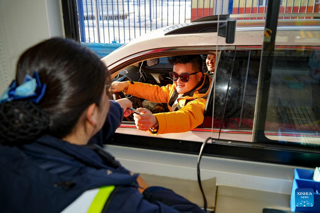Vehicles wait to pass a toll station for the Urumqi-Yuli Expressway in Urumqi County, northwest China's Xinjiang Uygur Autonomous Region, Dec. 26, 2025. The 22.13-km Tianshan Shengli Tunnel, the world's longest expressway tunnel, officially opened to traffic on Friday.