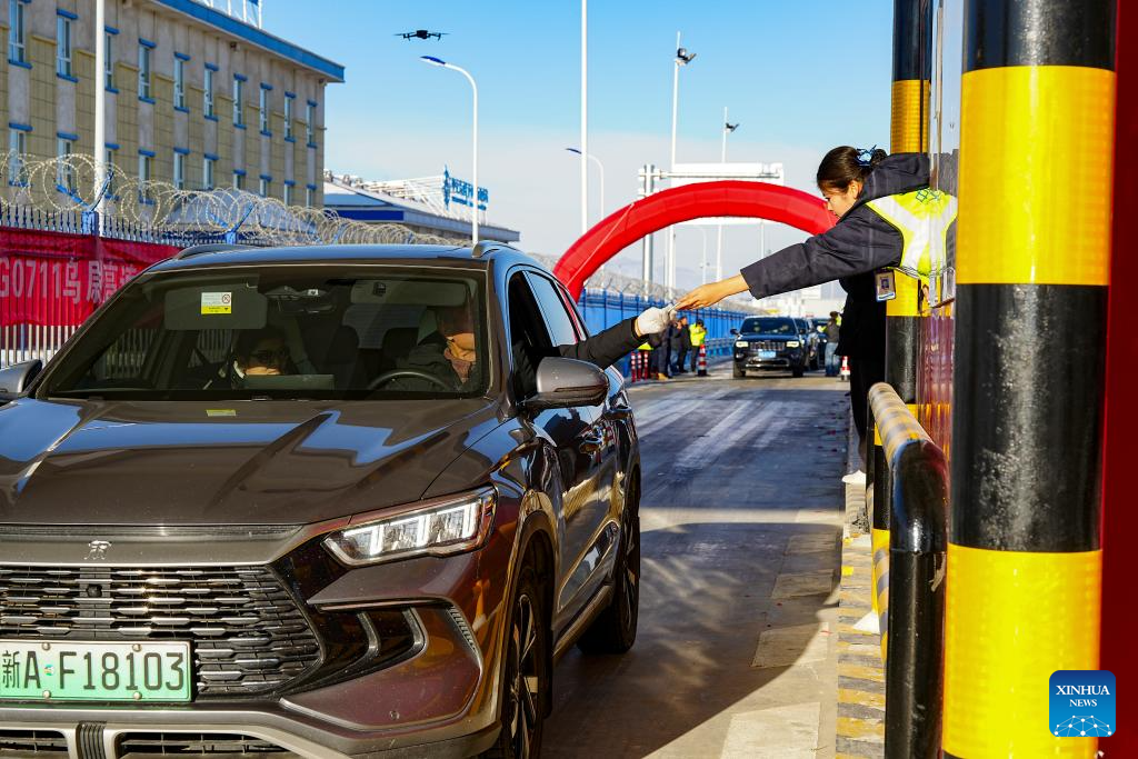 A policeman reminds a driver of safety precautions at a toll station for the Urumqi-Yuli Expressway in Urumqi County, northwest China's Xinjiang Uygur Autonomous Region, Dec. 26, 2025. The 22.13-km Tianshan Shengli Tunnel, the world's longest expressway tunnel, officially opened to traffic on Friday.