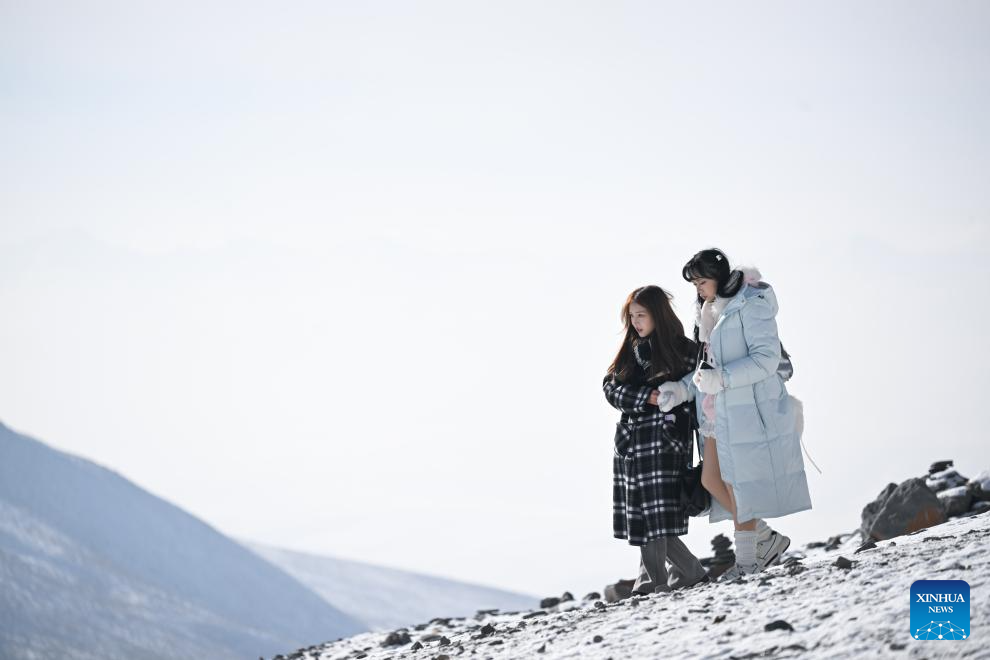 Tourists enjoy the scenery at Mt. Gangshika scenic area in Menyuan Hui Autonomous County, northwest China's Qinghai Province, Dec. 25, 2025. The snow-covered Mt. Gangshika, the highest peak in the eastern section of the Qilian Mountains, attracts lots of tourists in winter with its magnificent scenery. (Xinhua/Qi Zhiyue)