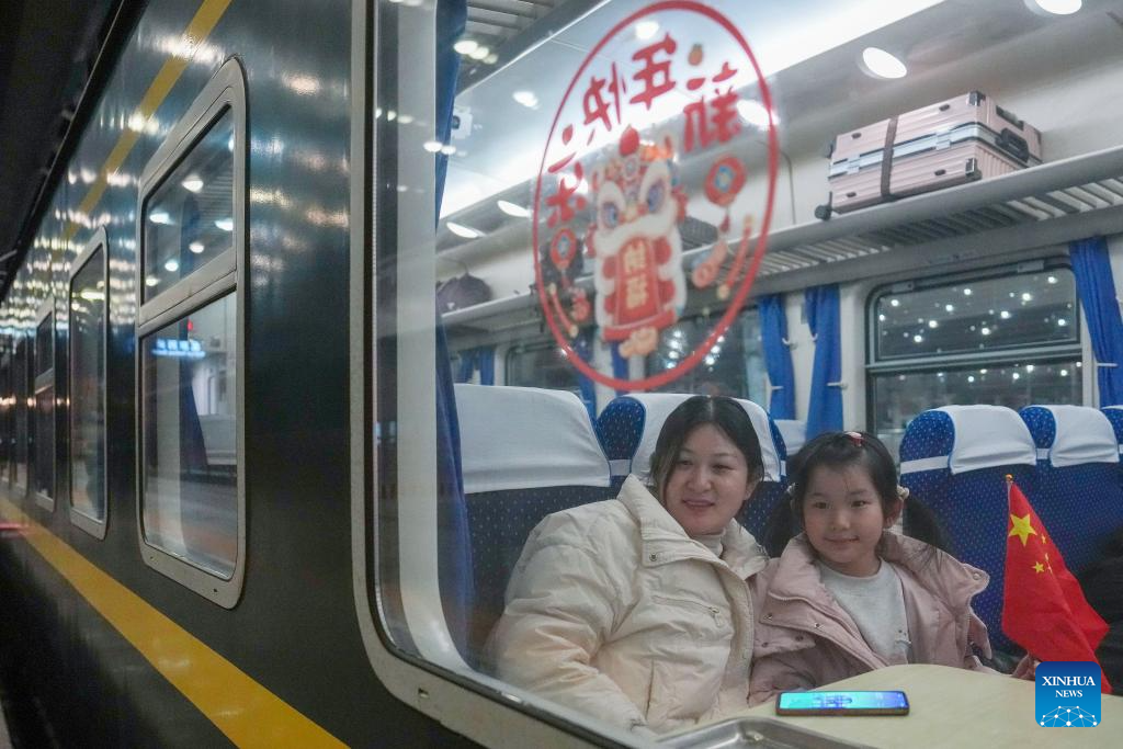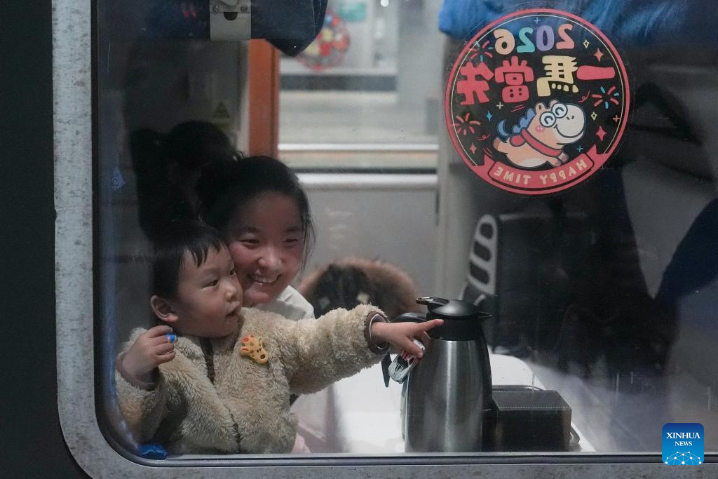Seven-year-old Xixi (R) is pictured with her mother on train No. K4069 before traveling back to their hometown Zhoukou in central China's Henan Province for the Spring Festival from Beijing West Railway Station in Beijing, capital of China, early on Feb. 2, 2026. China ushered in its largest annual population migration on Monday, 15 days ahead of the 2026 Spring Festival, also known as the Chinese New Year.
