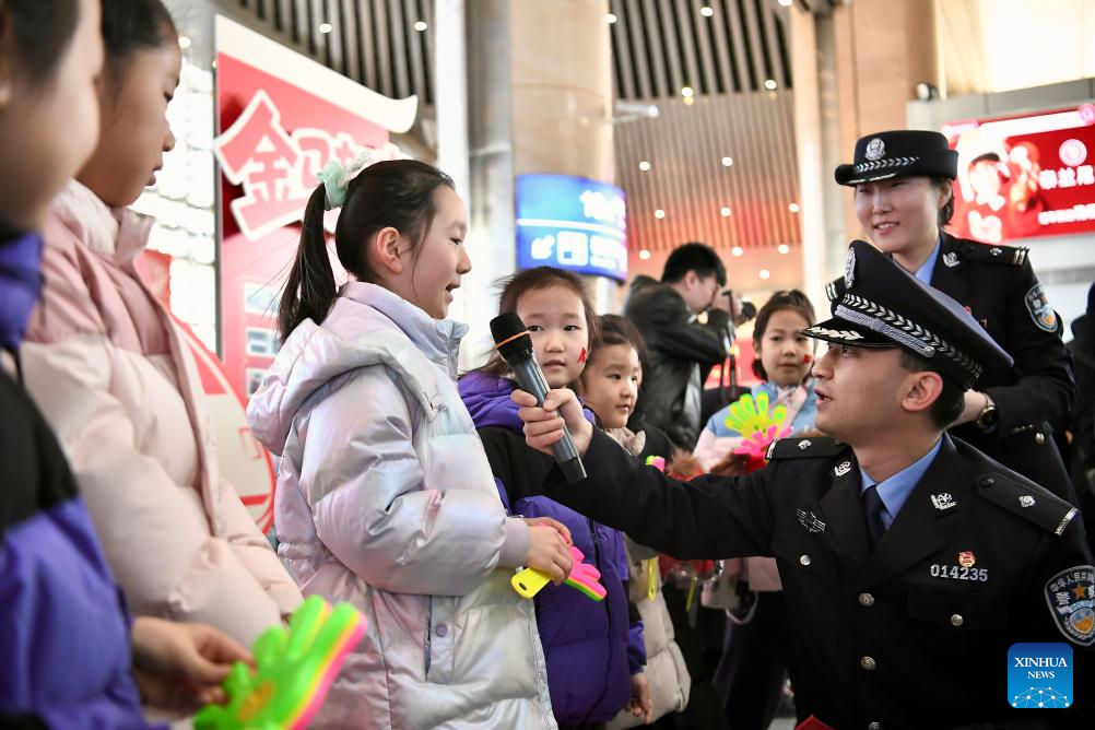 Police officers interact with children at Tianjin Railway Station in Tianjin, north China, Feb. 2, 2026.