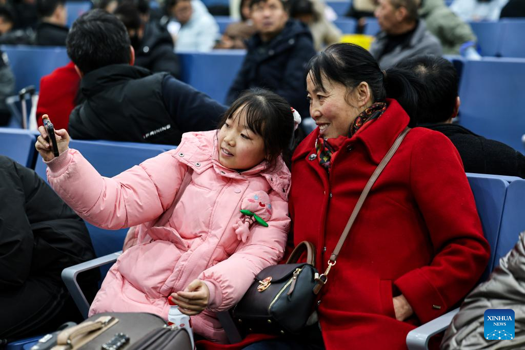 Five-year-old Dai Chenxi (R) plays with her grandfather at the departure hall of Beijing West Railway Station in Beijing, capital of China, Feb. 1, 2026. She will travel with her family on train No. K4069 back to her hometown Gushi in central China's Henan for the Spring Festival. China ushered in its largest annual population migration on Monday, 15 days ahead of the 2026 Spring Festival, also known as the Chinese New Year.
