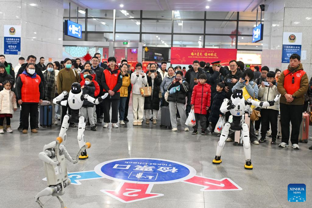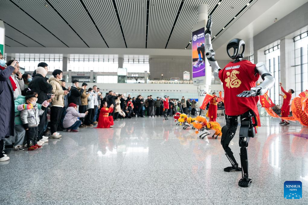 Robots dance for passengers at the waiting hall of Kunshan South Railway Station in Kunshan City, east China's Jiangsu Province, Feb. 2, 2026.