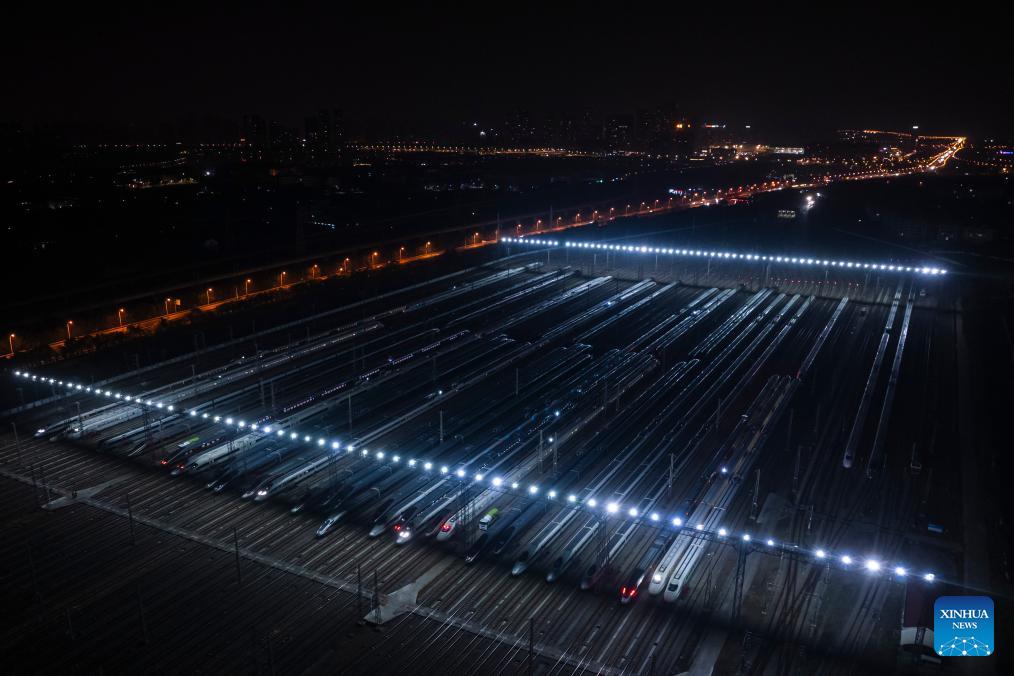 An aerial drone photo taken on Feb. 1, 2026 shows high-speed trains at a train depot in Wuhan, central China's Hubei Province.(Xinhua/Wu Zhizun)