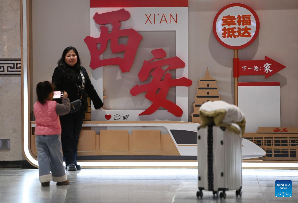 A woman poses for a photo in front of an installation at the departure hall of Xi'an Railway Station in Xi'an, northwest China's Shaanxi Province, Feb. 2, 2026. China ushered in its largest annual population migration on Monday, 15 days ahead of the 2026 Spring Festival, also known as the Chinese New Year.