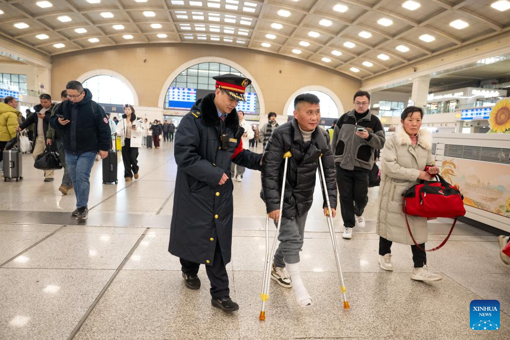 A staff member helps a passenger at Hankou Railway Station in Wuhan, central China's Hubei Province, Feb. 2, 2026.