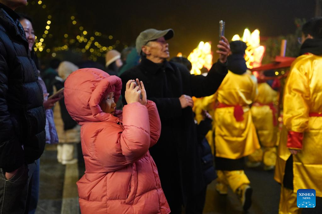A child watches a wooden-bench dragon dance during the Spring Festival gala held in Shenshan Village, Jinggangshan City of east China's Jiangxi Province, Jan. 31, 2026. With the Spring Festival drawing near, Shenshan Village in Jinggangshan City held a Spring Festival gala that invited residents from seven nearby counties in east China's Jiangxi and central China's Hunan provinces to participate. (Xinhua/Zhou Mi)