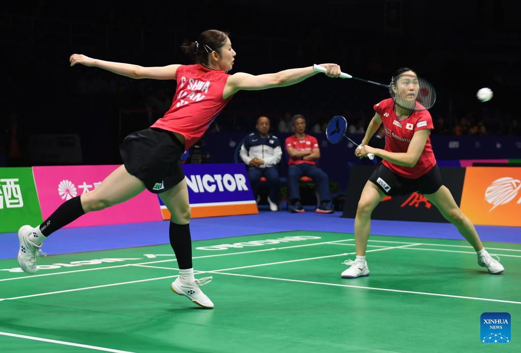 Yeung Nga Ting (L)/Yeung Pui Lam of China's Hong Kong compete during the women's doubles match against Nakanishi Kie/Shida Chiharu of Japan during the Group X match between Japan and China's Hong Kong at Badminton Asia Team Championships 2026 in Qingdao, east China's Shandong Province, Feb. 3, 2026. (Xinhua/Li Ziheng)