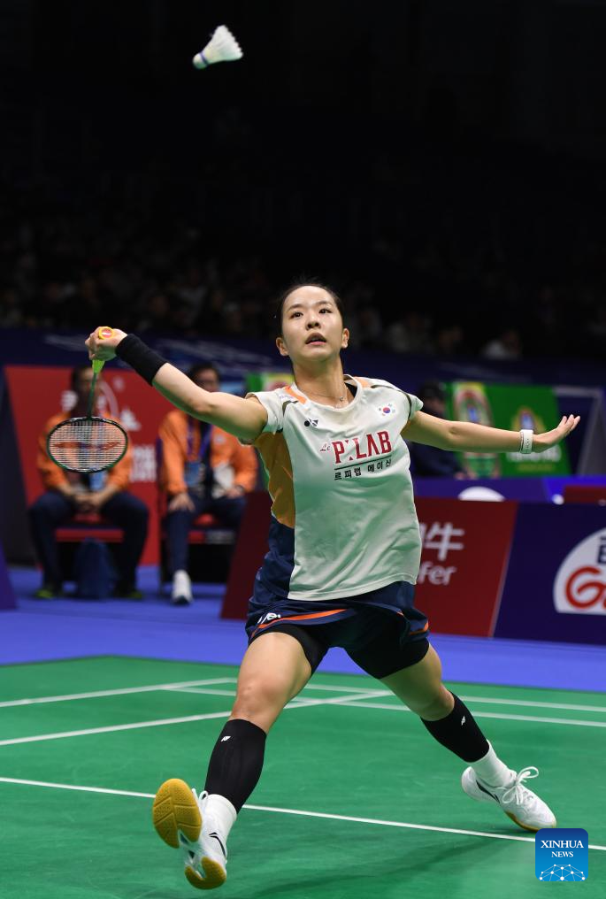 Kim Ga Eun of South Korea competes in the women's singles match against Yeo Jia Min of Singapore during the Group Z match between Singapore and South Korea at Badminton Asia Team Championships 2026 in Qingdao, east China's Shandong Province, Feb. 3, 2026. (Xinhua/Li Ziheng)